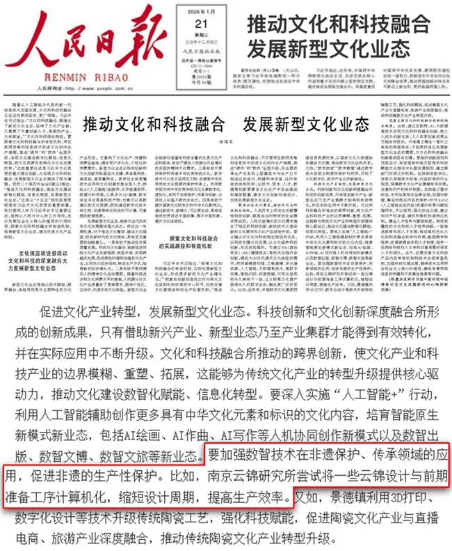 近日,在《人民日报》理论版刊发的在《推动文化和科技融合 发展新型文化业态》一文中,对南京云锦研究所的创新实践给予高度评价,将其列为“探索文化和科技融合的实践路径和有效机制”的优质案例。多年来,南京云锦研究所始终践行国家领导文化思想,不断推动文化和科技融合,发展新型文化业态,文中提到“南京云锦研究所尝试将云锦设计与前期准备工序计算机化,缩短设计周期,提高生产效率” ,呼应二十届四中全会规划中所指出:“探索文化和科技融合的有效机制,加快发展新型文化业态,形成更多新的文化产业增长点。”