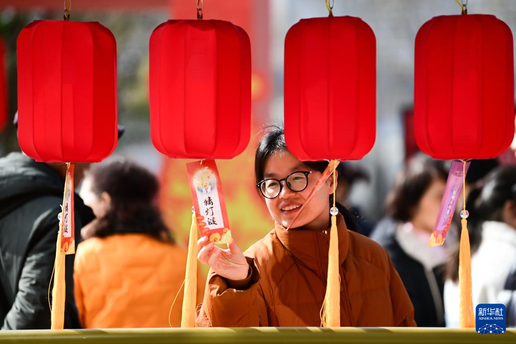 2月7日,游客在活动现场参与猜灯谜游戏。