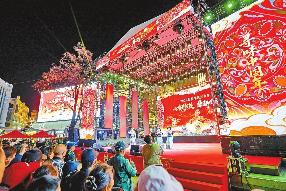 2026“云南非遗过大年”活动自1月30日在昆明启动以来,热度持续攀升。连日来,南屏街中心广场灯火辉煌,人潮涌动,舞台上非遗展演轮番登场,广场边非遗年货琳琅满目,为春城增添了浓郁的年味。