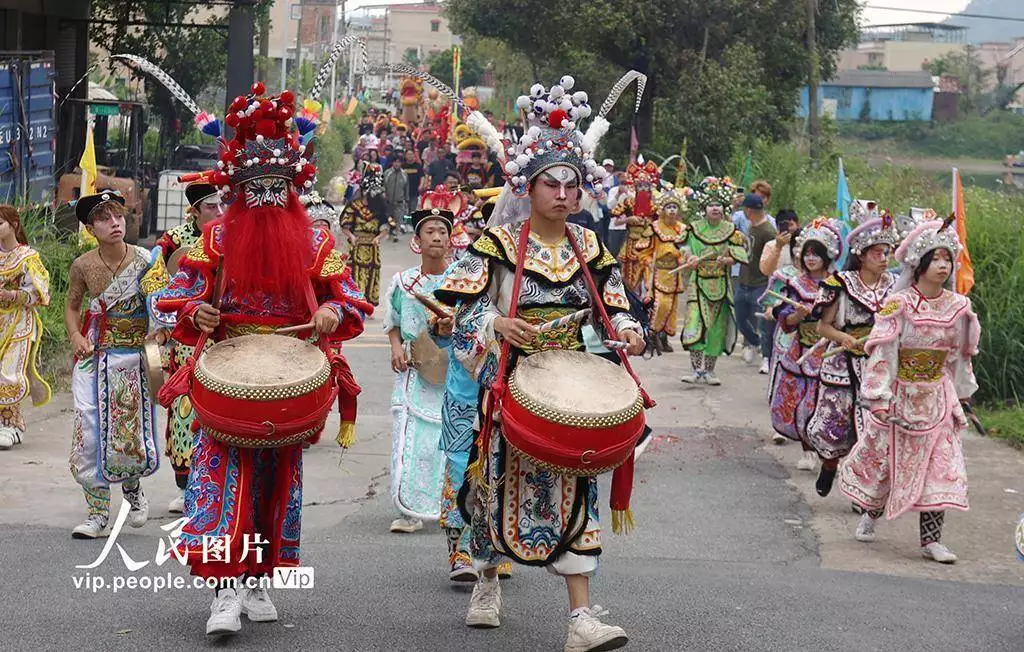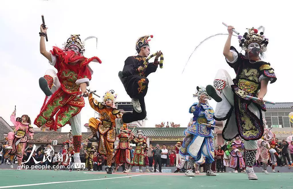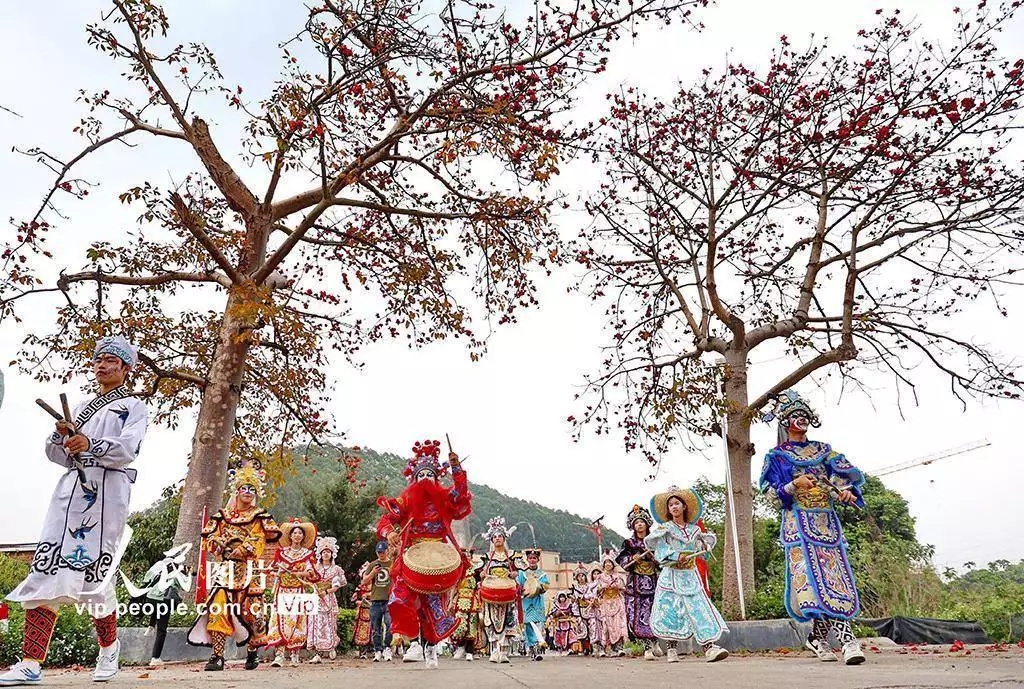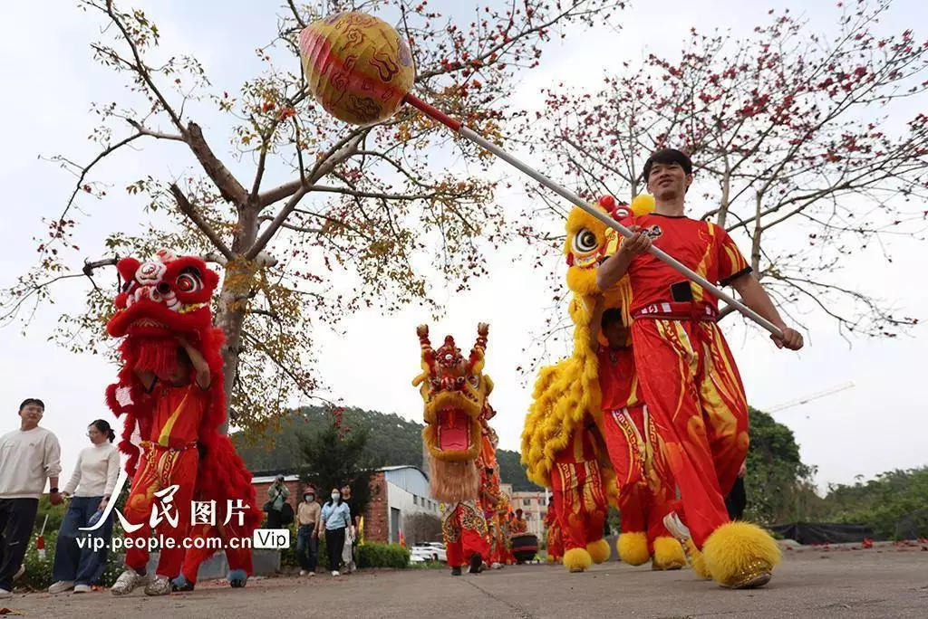 2026年3月11日,广东鹤山市鹤城镇坪山水心洞村热闹非凡,客家花炮庙会精彩开场,英歌舞、舞龙、舞狮等非遗项目轮番上演,吸引众多村民驻足观赏、拍照留念。黄继明摄(人民图片网)